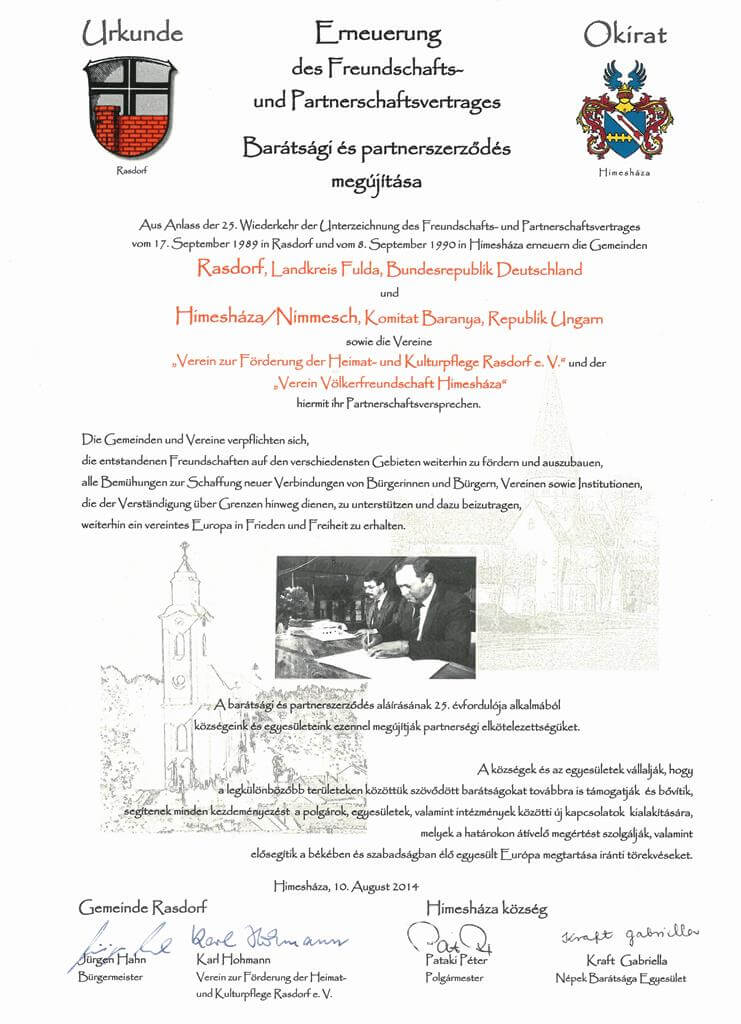 Anlässlich eines Aufenthaltes einer 12köpfigen Delegation aus Himesháza im Juli 1989 in Rasdorf mit dem damaligen Bürgermeister Hübner an der Spitze wurde vereinbart, dass der Partnerschaftsvertrag zwischen den beiden Gemeinden am 17. September 1989 geschlossen werden soll.